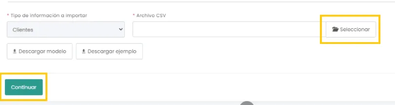 Cargar archivo en formato CSV con la información de cada cliente en el aparato “Seleccionar”. Luego, hacer click en “Continuar”.
