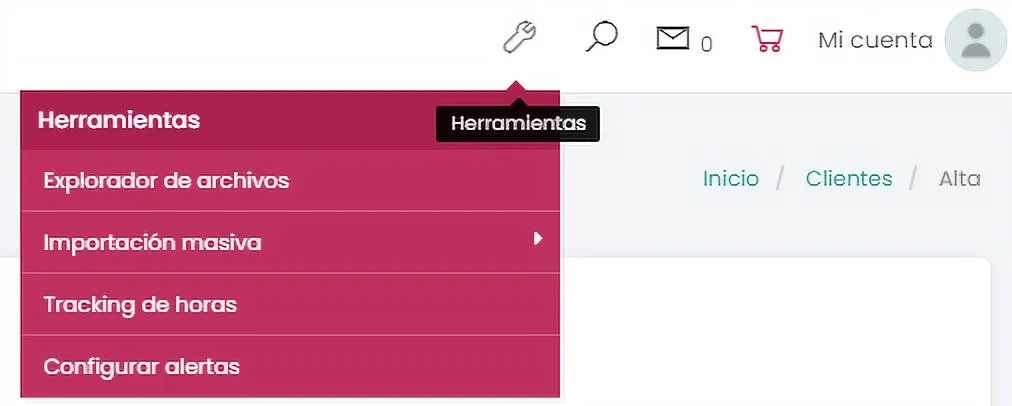 En la parte superior derecha, encontrarás el símbolo de una herramienta. Seleccionar, luego hacer click en “Importación masiva” y luego en el apartado “Clientes”.