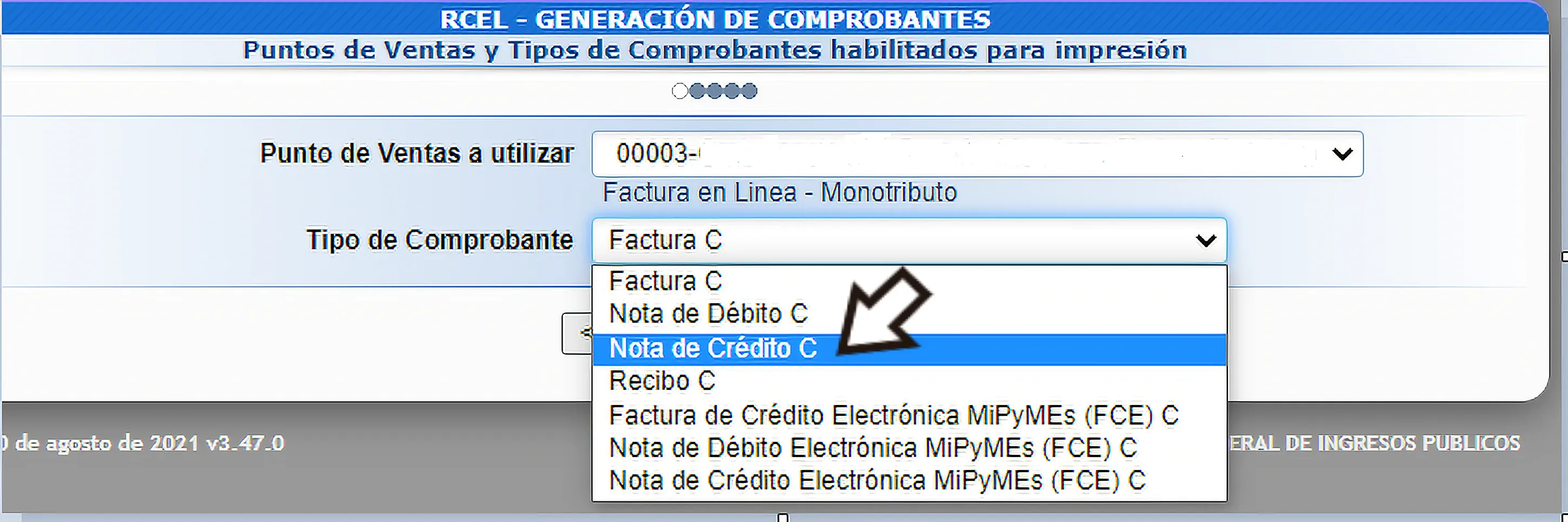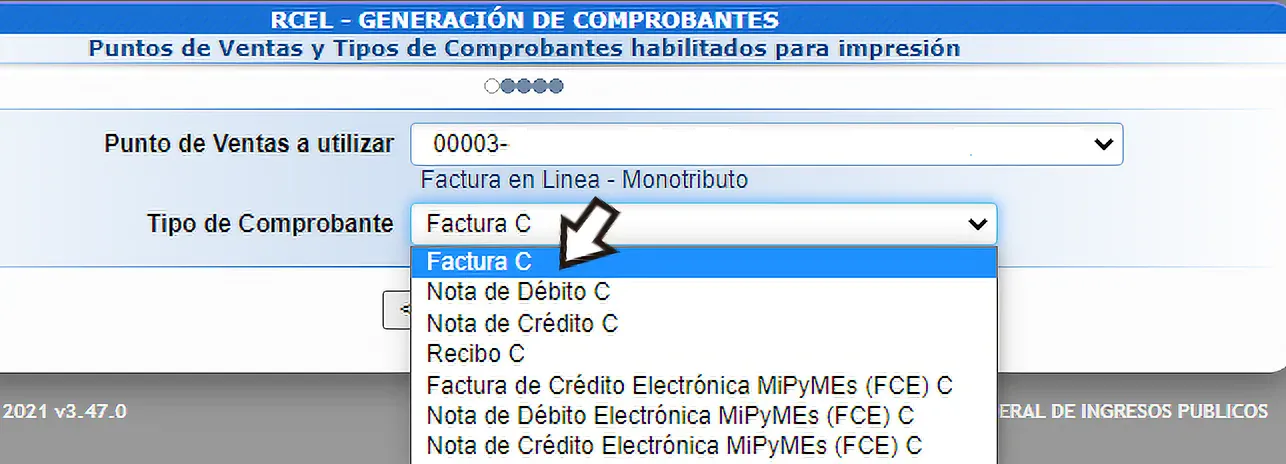 Seleccionar el punto de venta correspondiente y seleccionar el tipo de comprobantes que se quiere emitir.
